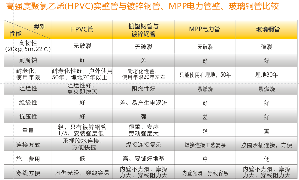 高強(qiáng)度聚氯乙烯(HPVC)實(shí)壁管具有高強(qiáng)度、高韌性、抗壓強(qiáng)、阻燃性好、耐腐蝕等特點(diǎn)。產(chǎn)品可代替鍍塑或鍍鋅鋼管,橫穿馬路或穿越橋梁作為通信電纜保護(hù)管,可代替MPP、PE管用于非開(kāi)挖管道。